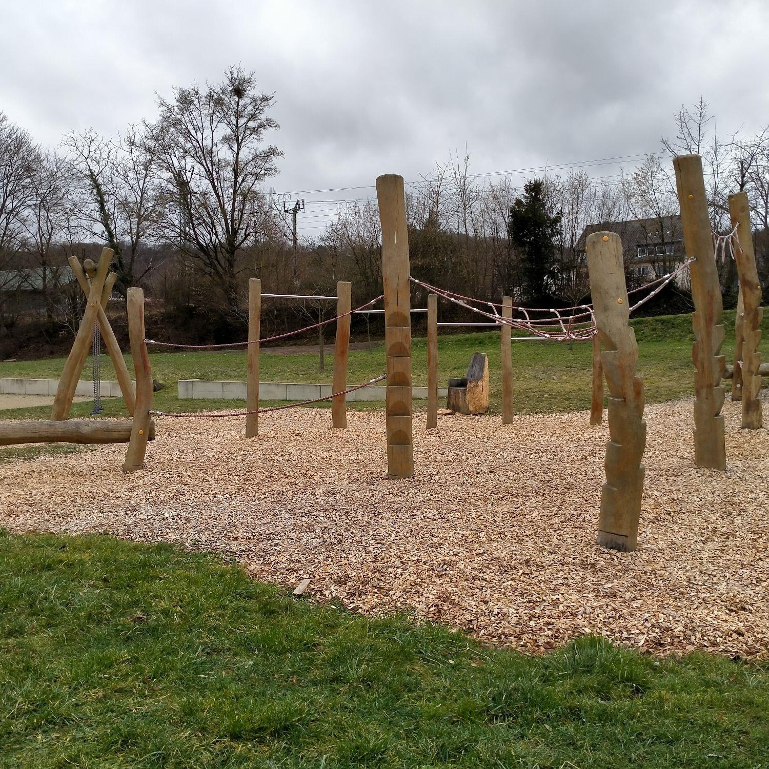 Playground at "Breyer Rheinblick" located directly by the Rhine, featuring seating, various climbing opportunities, and play equipment, right next to a wildflower meadow.