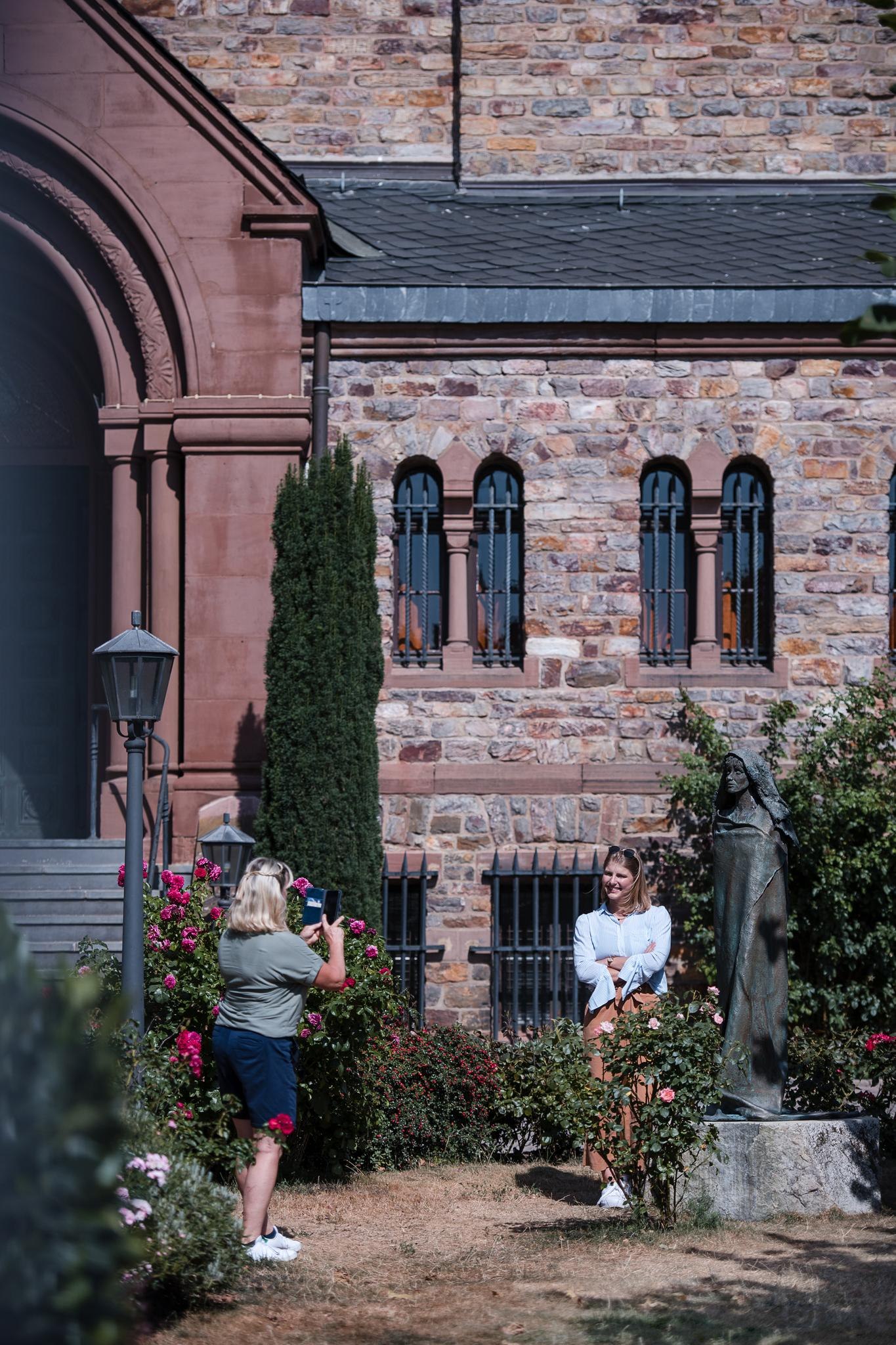 The Benedictine Abbey of St. Hildegard above the town of Rüdesheim am Rhein was built at the beginning of the last century. It directly traces its roots to the time of Saint Hildegard of Bingen, who founded the "predecessor monastery" of Eibingen, which was resettled in 1165 and secularized in 1803. To this day, the Benedictine Sisters at St. Hildegard live according to rule set over 1400 years ago, based on the teachings of St. Benedict – love of God, humanity, joy in faith, and a realistic, pragmatic view of humankind. A large monastery shop, a vineyard, a spelt products distribution, a goldsmith, a ceramics workshop, and a restoration workshop for ecclesiastical archives form the economic foundations of the world-famous monastery. The abbey also offers guest rooms where individuals can seek quiet and reflection for a limited time behind the walls of St. Hildegard or participate in courses and seminars held by the Benedictine Sisters.