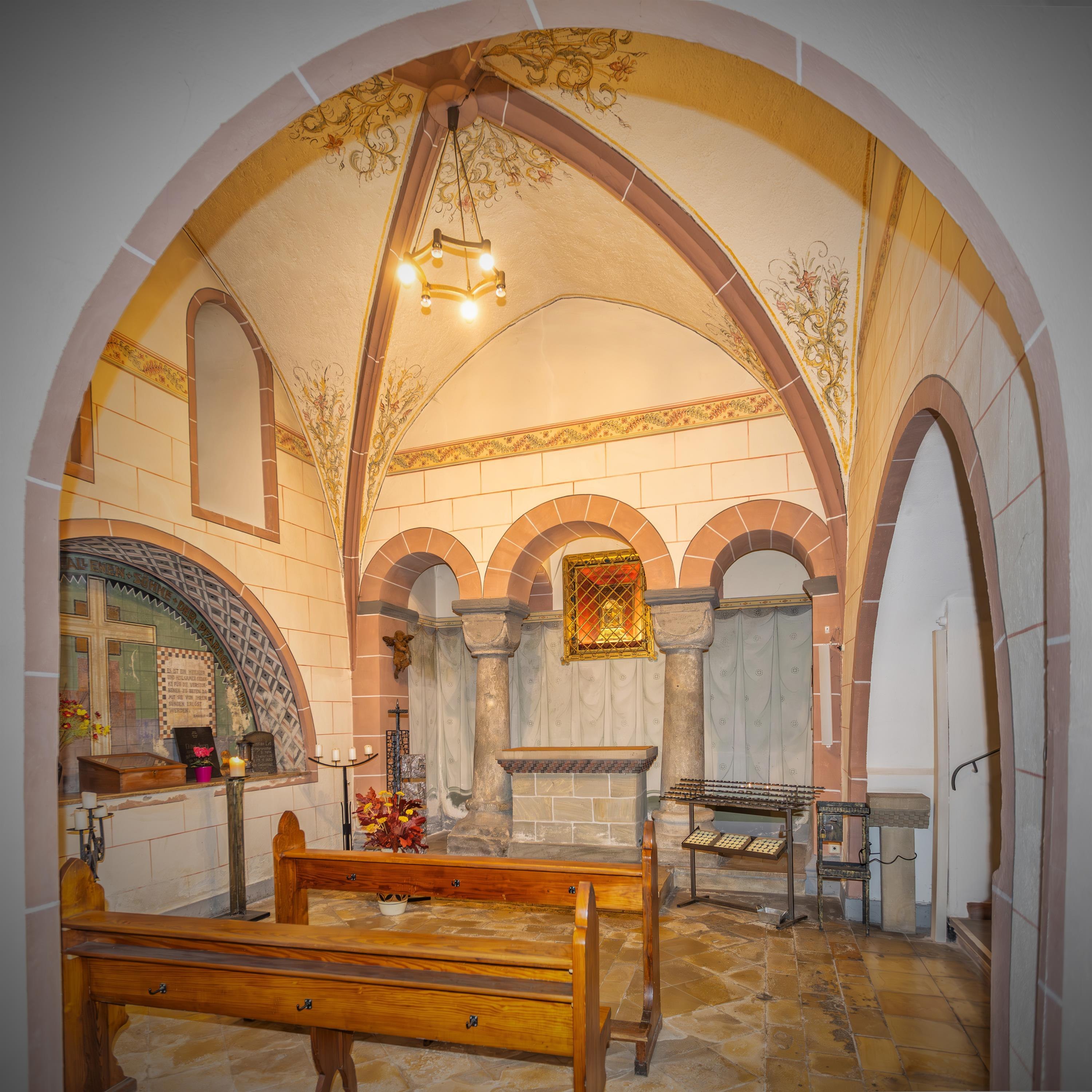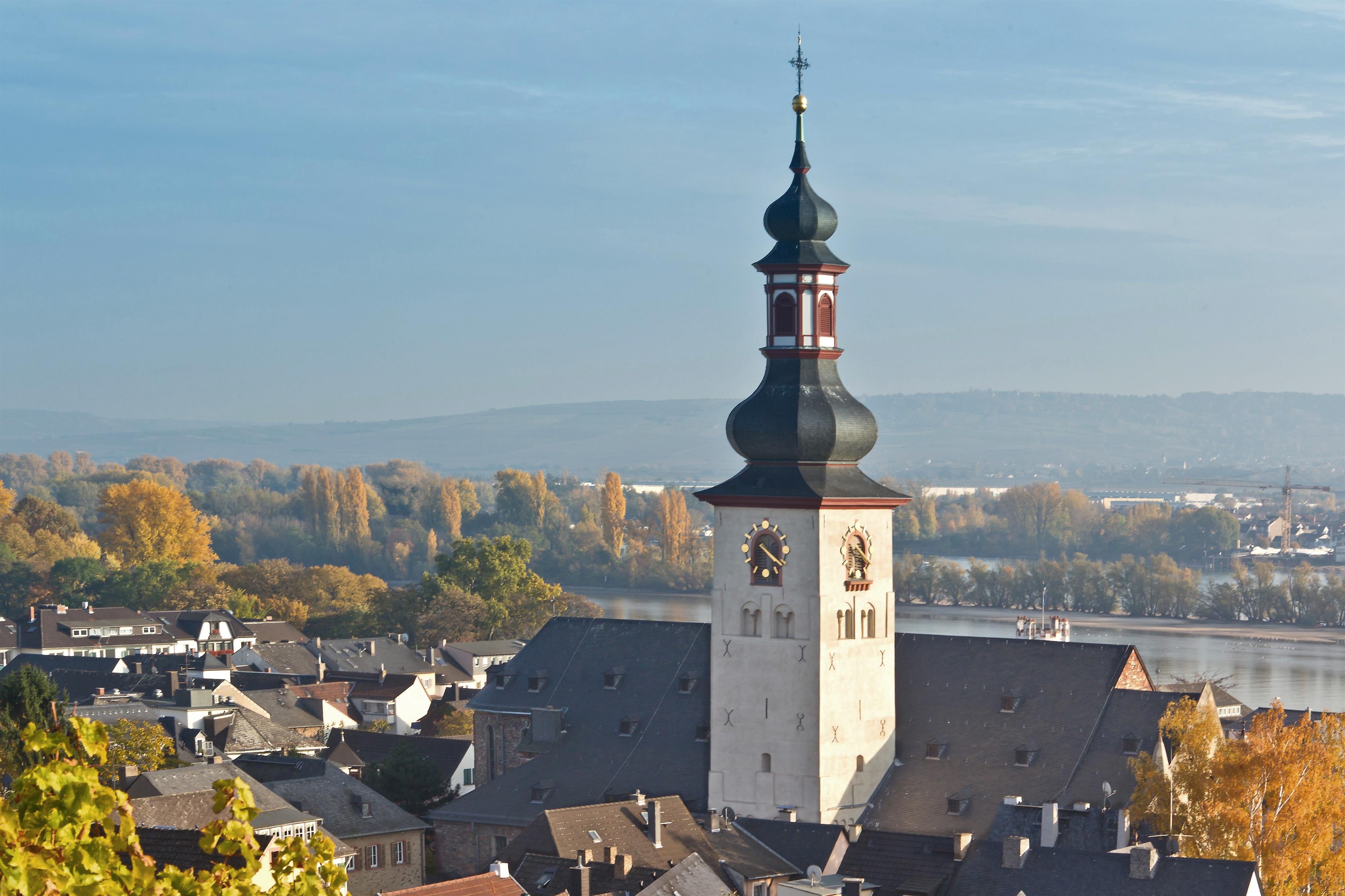 The tower is topped by a weather vane featuring a crescent moon and star, commemorating the Crusades in which the knight took part. After being almost completely destroyed in 1944, it was rebuilt using Rhenish rubble stone masonry. Noteworthy are the medieval portrait tombstones of the Rüdesheimer nobility as well as the Gothic tympanum.