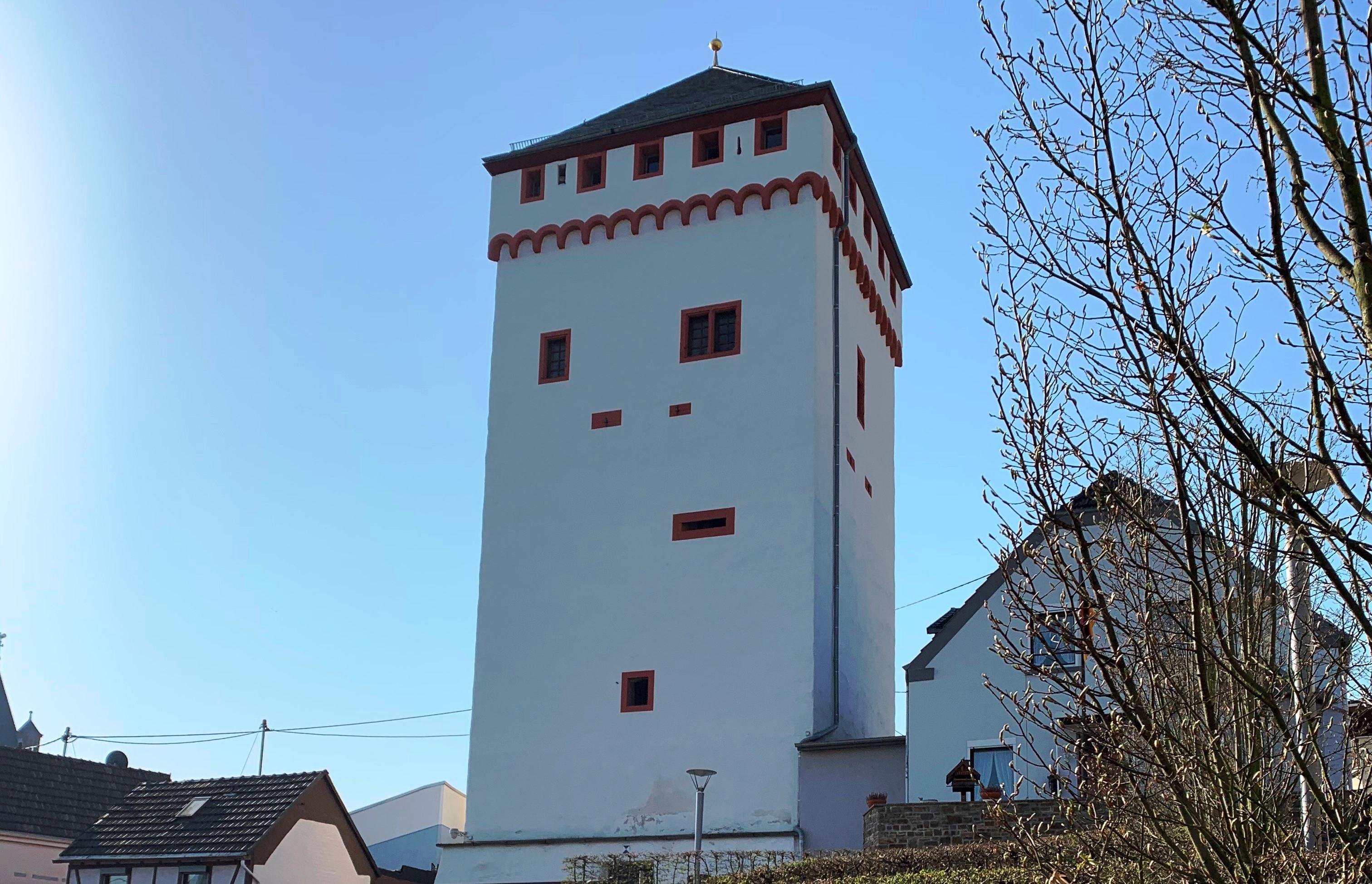 The free-standing 28.5 metre-high keep and defence tower was built near the Rhine by the Archbishop of Trier, Werner von Falkenstein, at the beginning of the 15th century. At that time, it served as a safeguard for the customs house and consolidation of the border line to the territory of the Electorate of Cologne in the North. The plastered drystone construction was erected in place of the Kettiger Turm, attested in 1298, and formed the beginning of a safeguarded boundary line from Weißenthurm to Mayen. The “wieße Thorn” (old German for white tower) safeguarded the customs barrier once located there together with the customs house and guaranteed the Archbishops of Trier the revenue of the customs for the land. Today, the tower serves more romantic purposes: weddings and functions can be celebrated here.