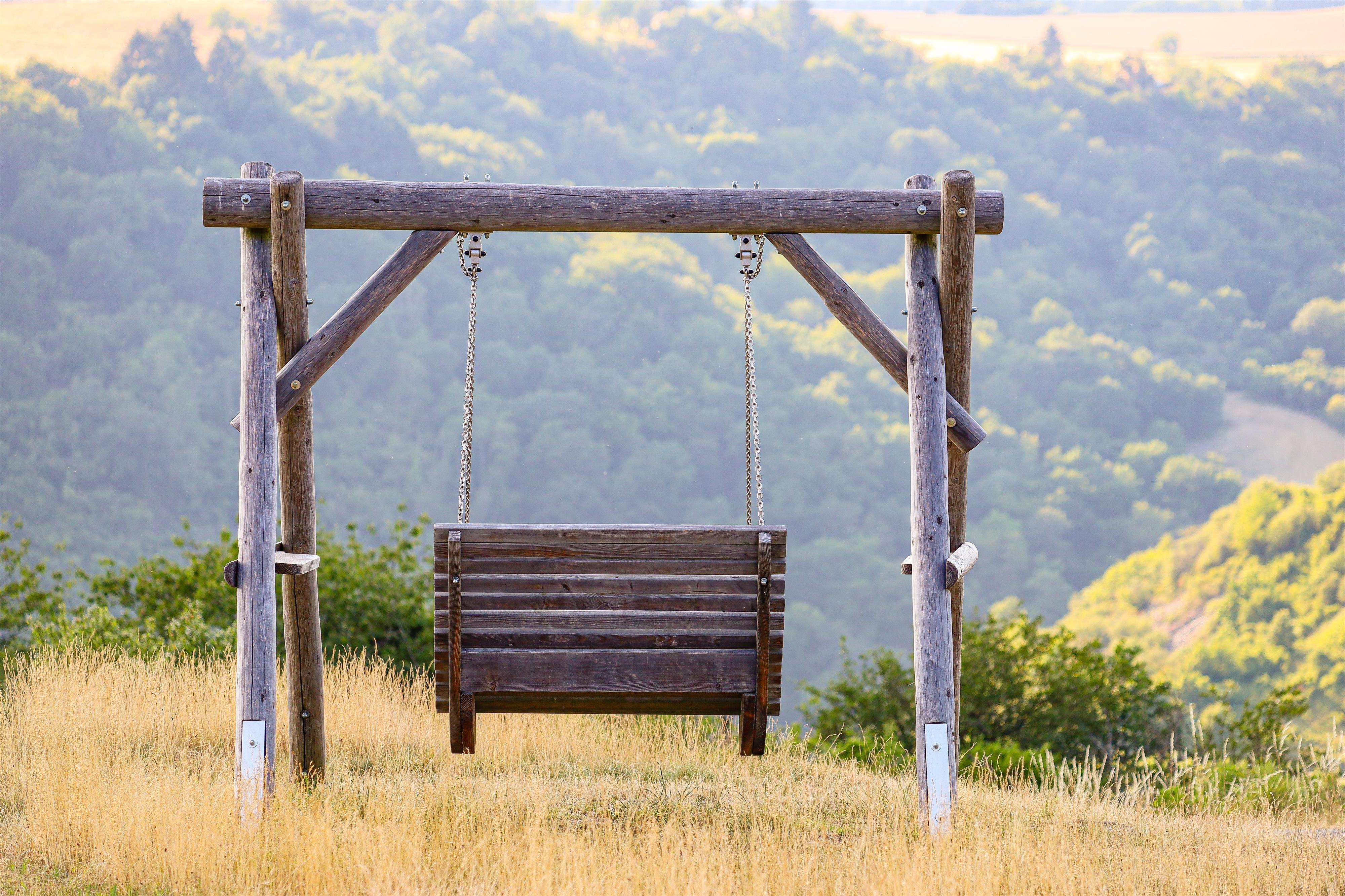 Houten schommel met droomhaven uitzicht nodigt uit om te blijven hangen.