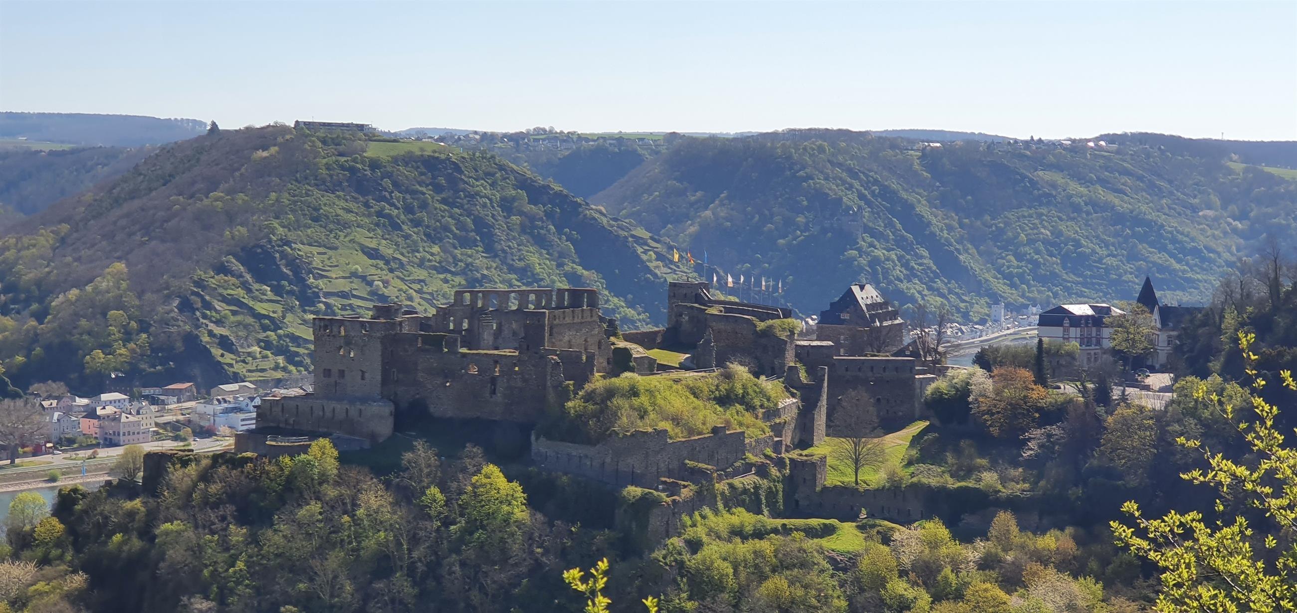Uitkijkpunt "Rheinfelsblick" tegenover het Rheingoldbad in Werlau, met een prachtig uitzicht op het kasteel en het Middenrijndal.