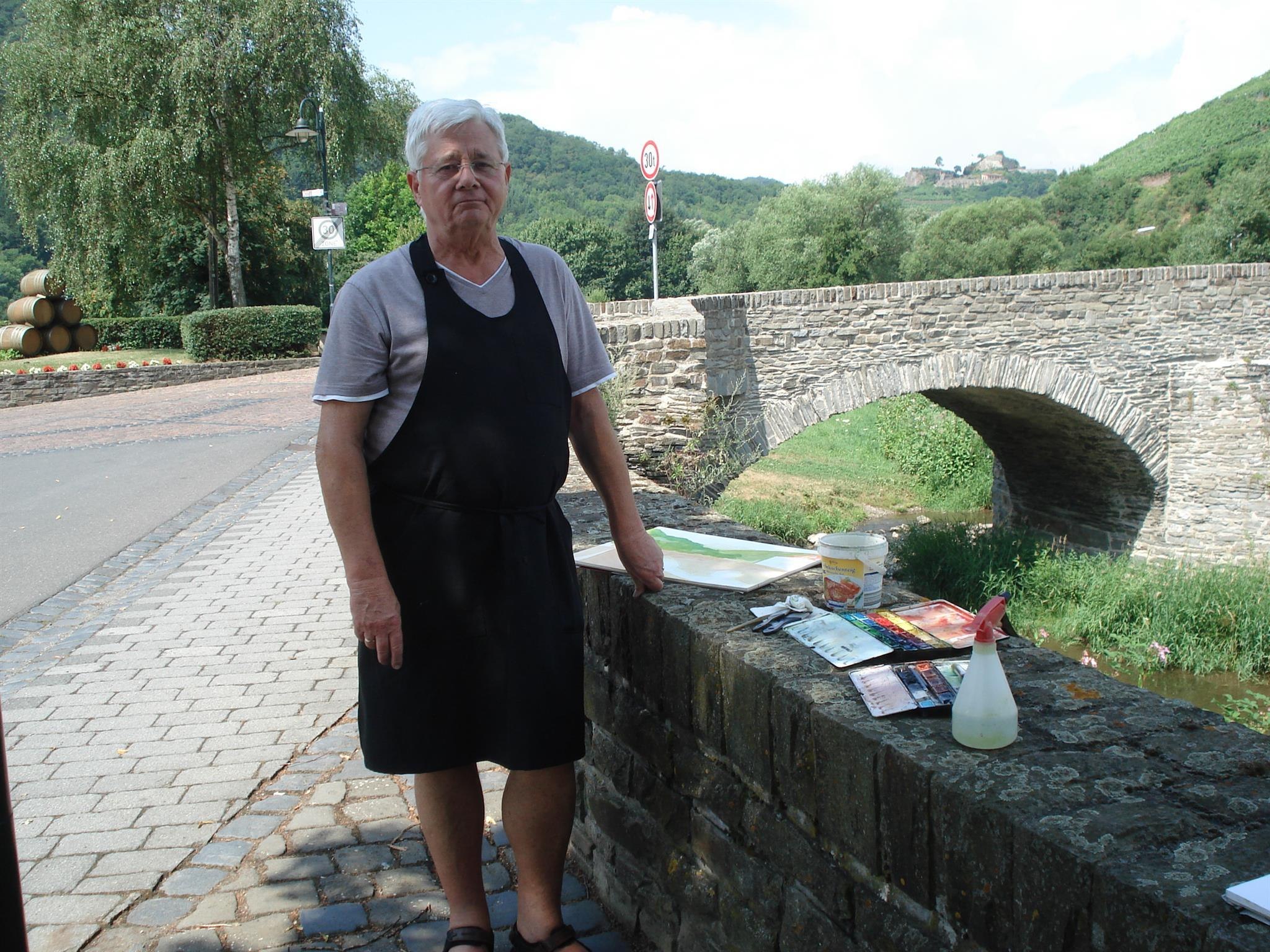 VITA De heer Schmitz is een enthousiaste hobbyschilder wiens werk af en toe te zien is op openbare tentoonstellingen in Linz. Sinds 2005, toen hij met pensioen ging, is aquarelleren een van zijn grote passies. Schilderen is voor hem het ideale medium om te ontspannen. Tegelijkertijd biedt aquarelleren hem de mogelijkheid om zich onder te dompelen in de wereld van kleur en creativiteit. Dit wordt ook mogelijk gemaakt door de vele schildercursussen en schilderseminars waaraan hij van 2005 tot 2010 in de Pfalz heeft deelgenomen. Geboren in Neuwied/Rijn in 1943, woonde in Linz/Rijn tot 1970 Opgeleid aan de Stadtsparkasse Linz als bankbediende/spaarbankadministrateur Tussen 1970 en 2005 onder andere reclamemanager bij Bezirkssparkasse Rastatt, adviseur bij Sparkassen- und Giroverband Rheinland-Pfalz in Mainz, directeur marketingafdeling bij Kreissparkasse Kaiserslautern, actief in verenigingen en lokale politiek. Sinds 2010 woont hij samen met mijn vrouw weer in zijn oude woonplaats Linz am Rhein. Sindsdien wijdt hij zich ook aan het aquarelleren in Linz en breidt hij zijn kennis uit door deel te nemen aan schildercursussen in de nabije en verre omgeving van Linz. De bijzondere aantrekkingskracht van deelname aan schildercursussen ligt voor hem in de verscheidenheid aan kennis die door de verschillende kunstenaars wordt overgedragen. Door zijn maatschappelijke betrokkenheid bij fair trade (sinds 2012 voor de verenever tentoonstellen.iging Eine-Welt Linz e.V., sinds 2013 voor de Weltladen Linz en sinds 2018 in de stuurgroep Fairtrade Town Linz) ontbrak het hem de laatste jaren aan de nodige tijd voor exposities. Vanaf 2020 wil hij zijn aquarellen weer intensi