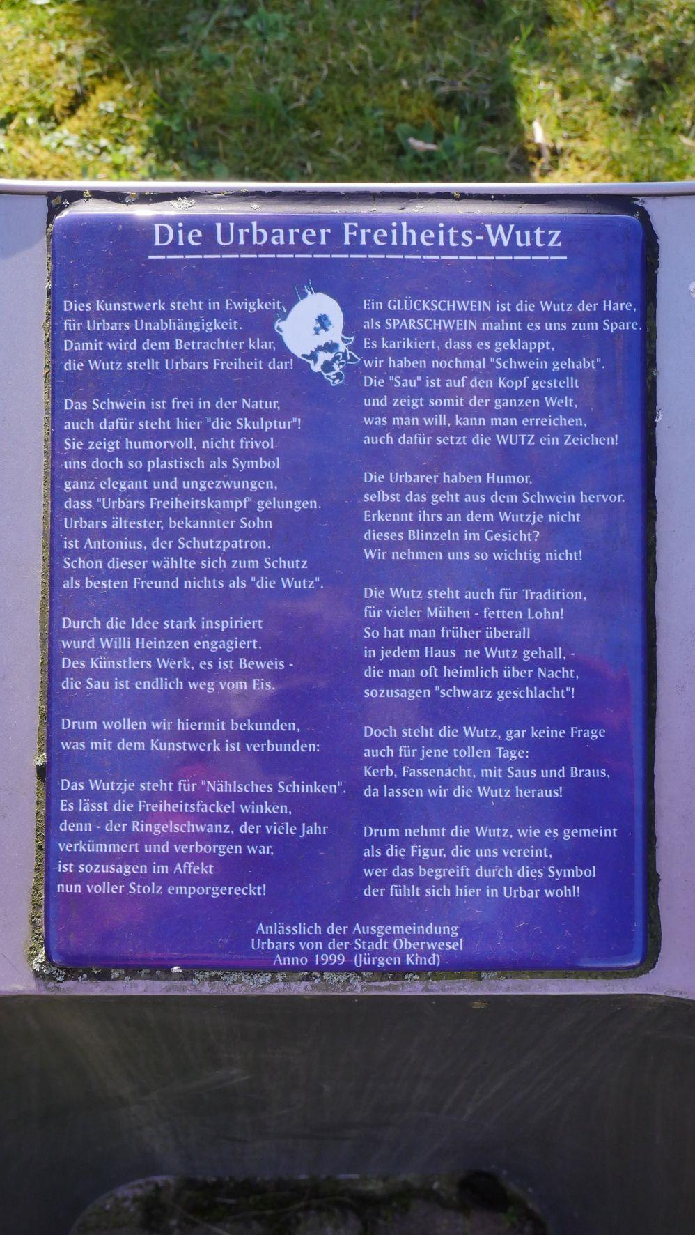 Urbar is sinds 1999 weer een zelfstandige gemeente. Deze gebeurtenis was een nieuw monument voor het dorp waard, dat door de plaatselijke kunstenaar Willy Heinzen werd gemaakt in de vorm van een "Freiheitswutz".
